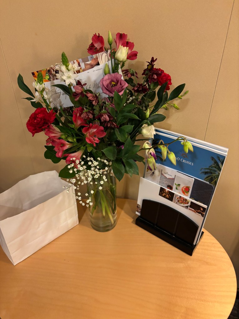 In our cabin we found gifts from P&O for the World Cruise, also a bottle of Prosecco from Angela our Travel Counsellor and then a beautiful vase full of flowers for me from Andy ♥
