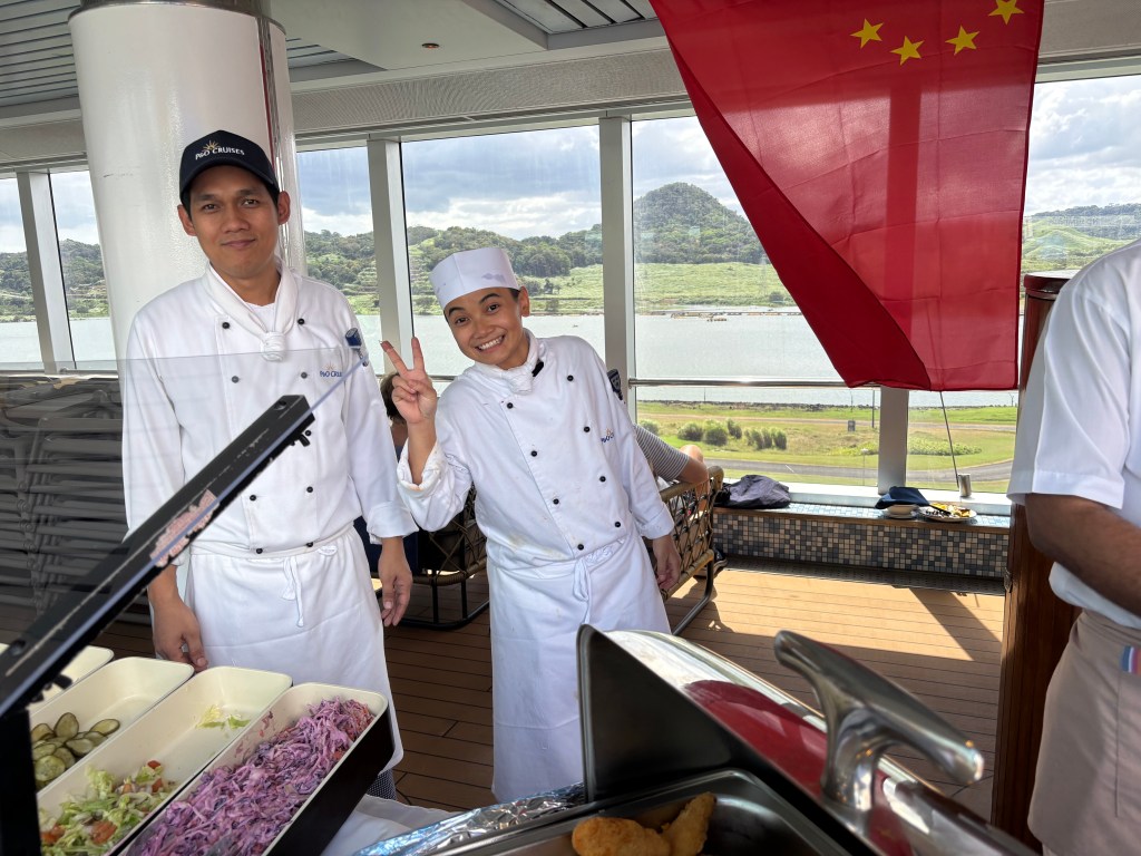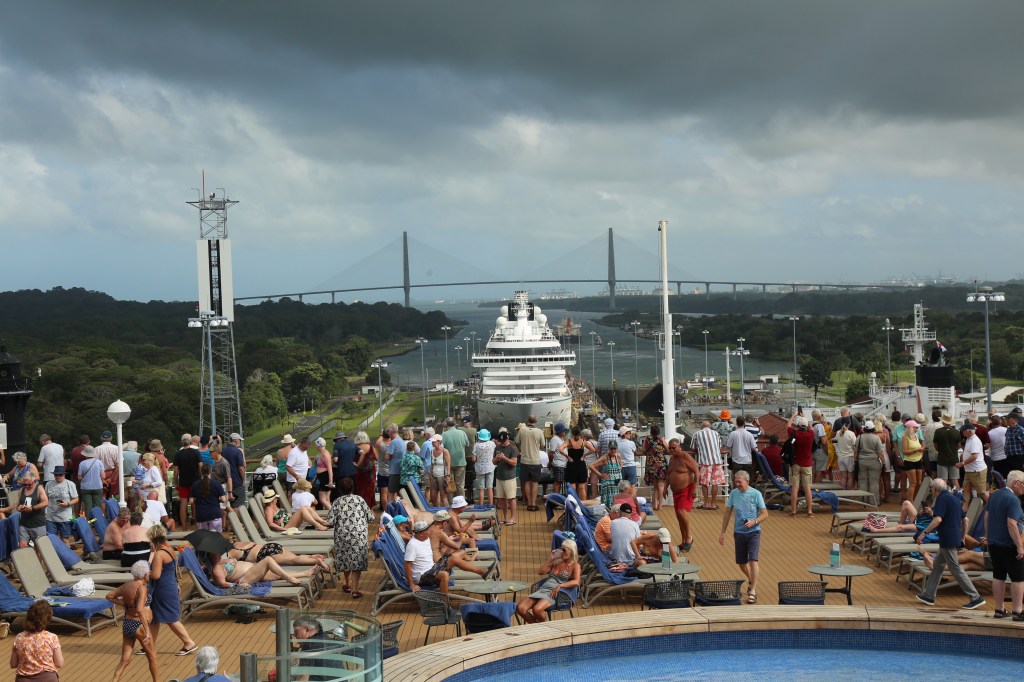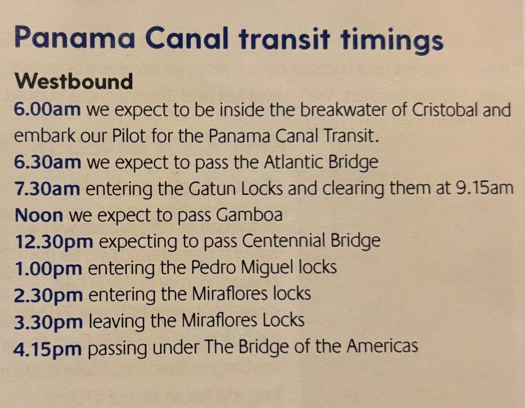 We have a day at sea before experiencing the Panama Canal. It’s a day of sunshine and calm Caribbean Sea to relax and enjoy. After reading the HORIZON we have the usual 10am deck quoits for myself and at 10:45 Andy has his bridge session. We will fill our time with relaxing and reading. Taking a dip in the pool. A walk around the promenade deck. We joined in the quiz in the Rising Sun (The pub onboard) before heading to lunch in the MDR.