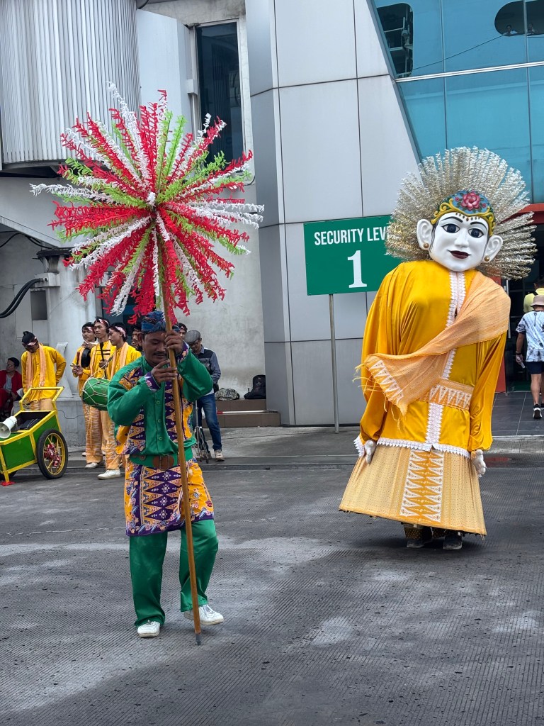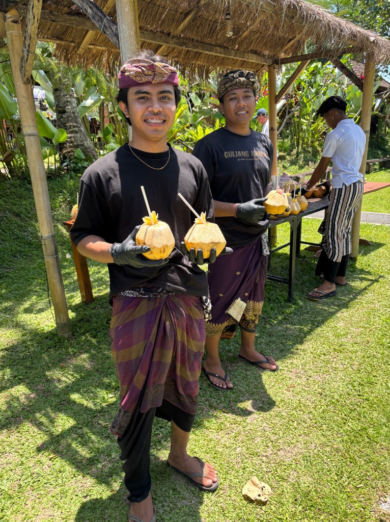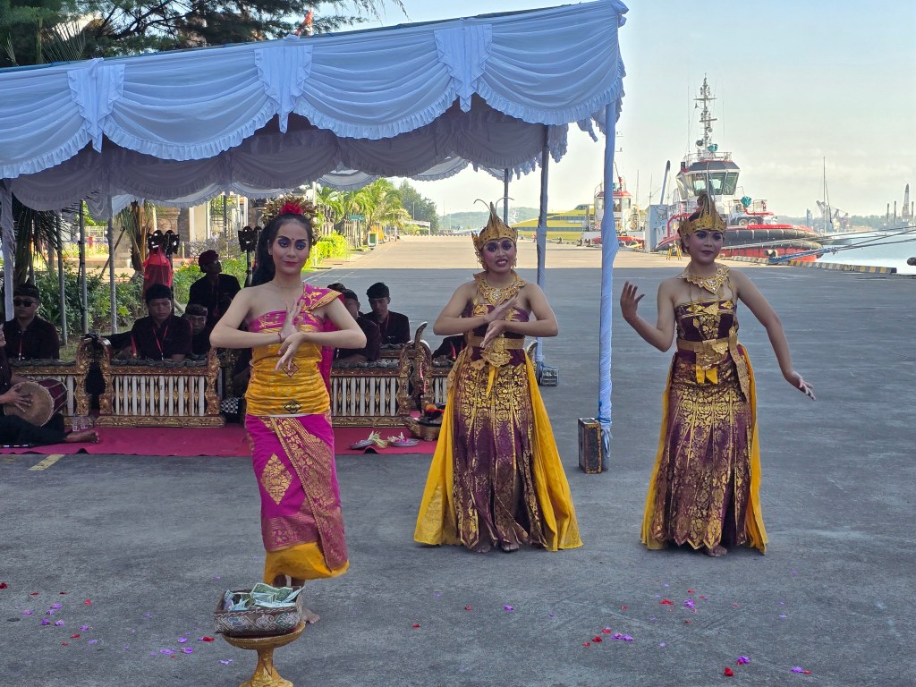 We are over the halfway mark now on our 2025 World Cruise and sailing into Bali, a province of Indonesia. We had an early breakfast as we have a tour booked to see the most we possibly can of this island. As we leave the ship we are greeted by Balinese performers on the quayside all in traditional dress.