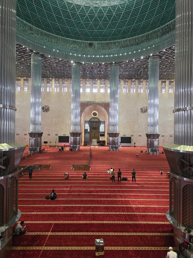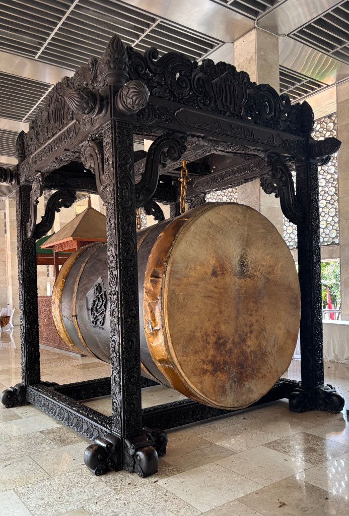 Our next port is Jakarta. This is Indonesia’s massive capital and it sits on the northwest coast of the island of Java. The drive to our first destination was very busy and once again motorcycles were the main mode of transport for locals. On our tour today our first stop was The Jakarta Cathedral but as we arrived we were told we couldn’t enter as a service was going on. So across the road we went to the Istiqlal Mosque, the largest in Southeast Asia holding up to 200,000 worshippers. Once again we needed to have our knees and shoulders covered and also remove our shoes. It was huge and looking from a balcony area down to the area for prayers it was very calming. We saw the Bedug, an instrument very much like a gong that is used to signal prayer times.