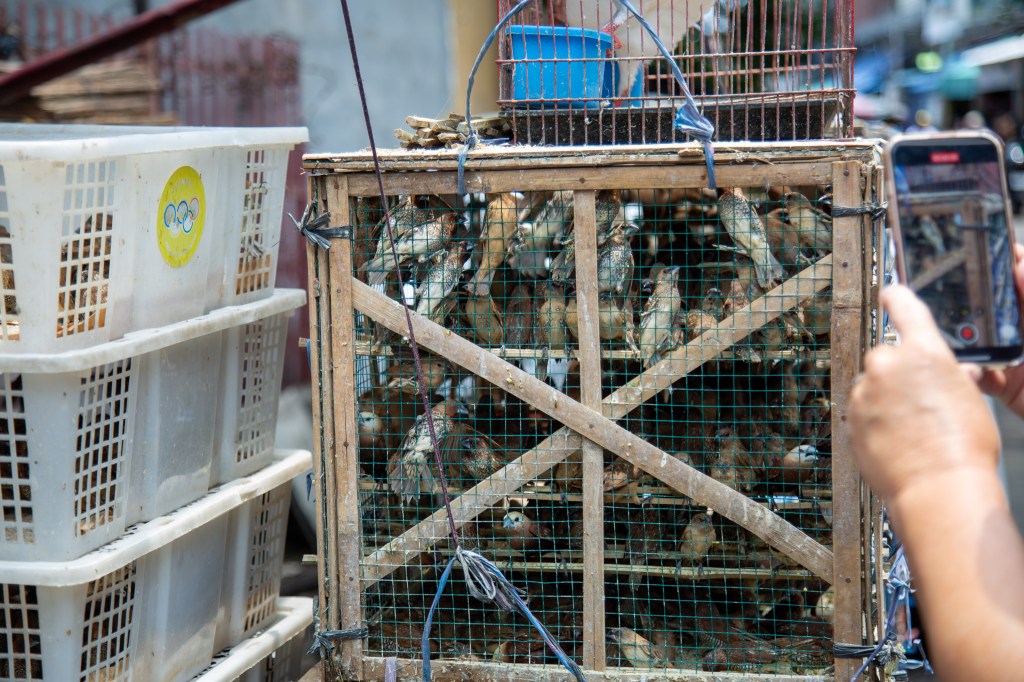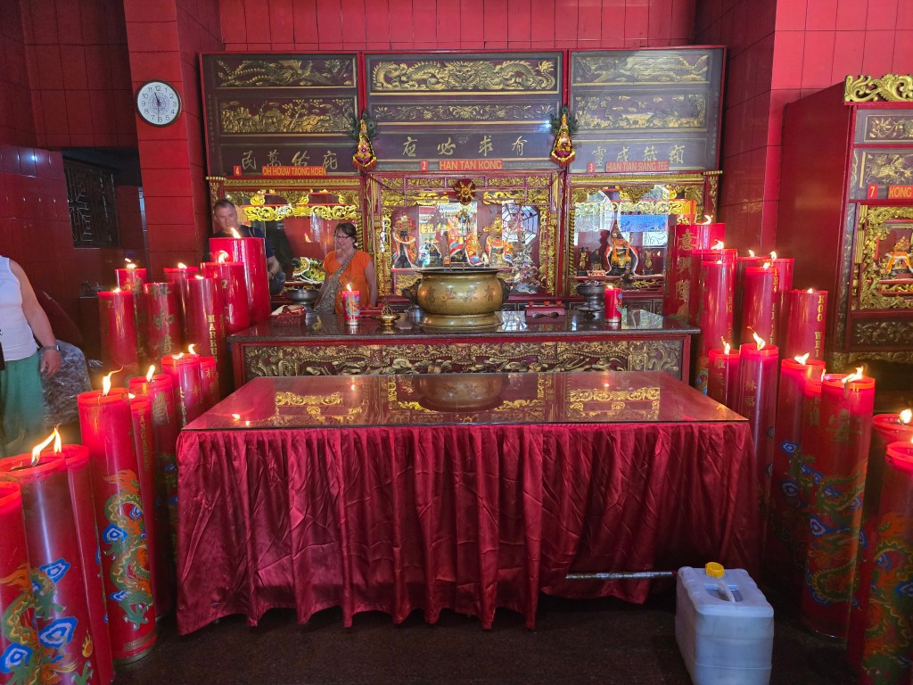 Next stop is Chinatown and walking through the market stalls where the strangest things are being sold. Fish parts, baby frogs and turtles, chicken feet and much more. It’s narrow to walk but then shoppers come to the stalls on their motorcycles. We follow the line and end up in the temple. There are cages of small birds outside. It’s a small temple built in 1650 and still used for worship but also for visitors photos now.