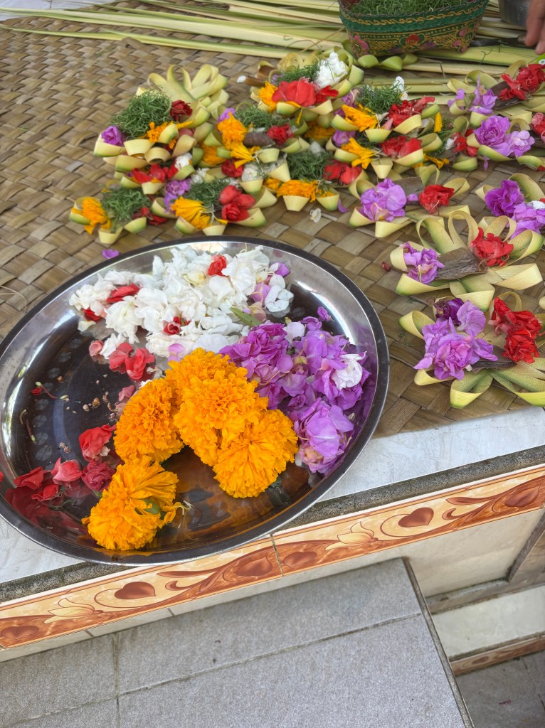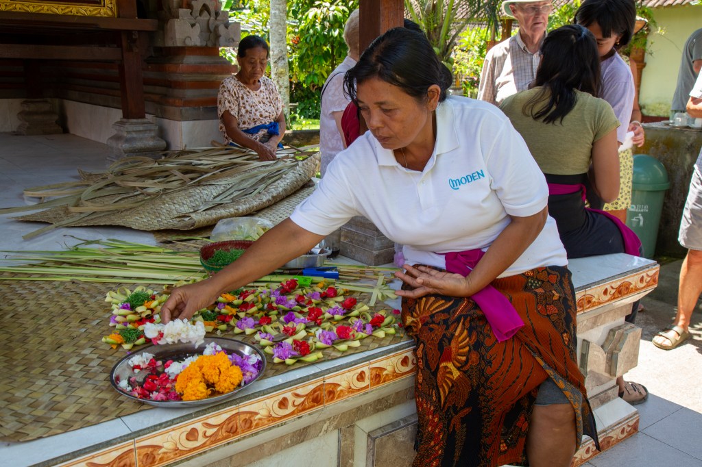 We had lovely traditional snacks and drinks as we were entertained. It was so hot and humid, everyone was looking for shade. They made floral gifts to be left at the shrine as they prayed. As we got back on the bus that little bit of air conditioning was so good!