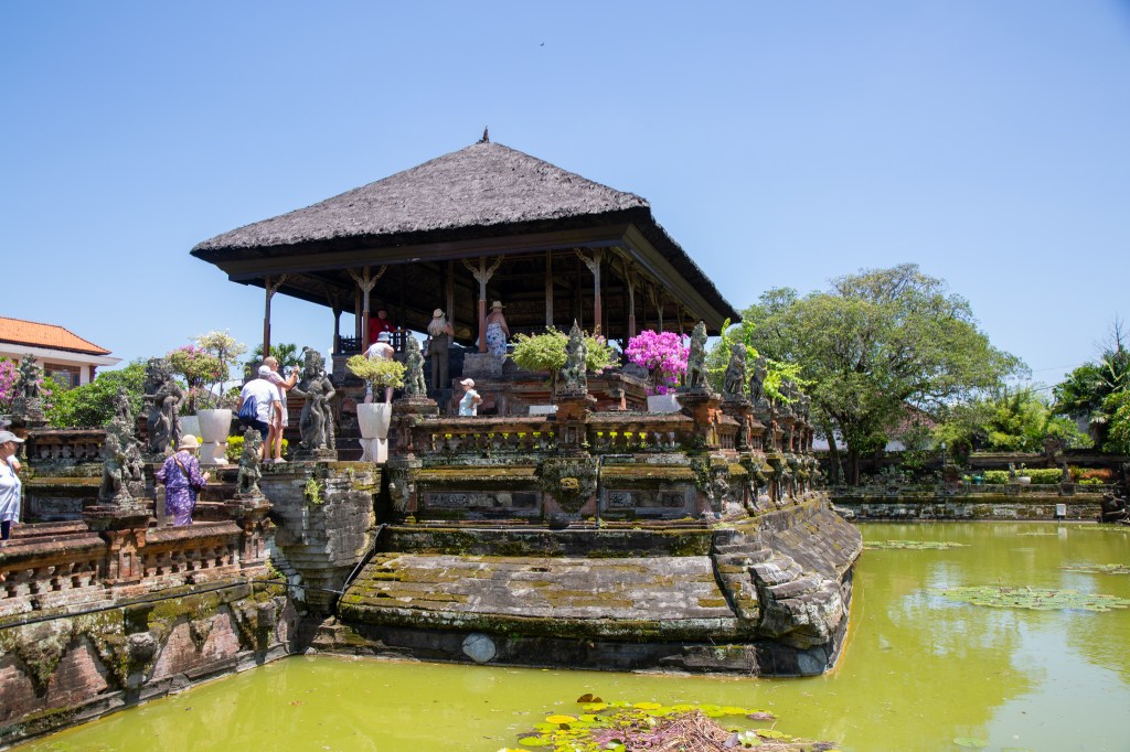 We went just along the road and to another temple. Taman Wisata Kertha Gosa. The central part of the building was surrounded by water and huge Lilly pads. This was in better condition and you could see how the community took care of it.