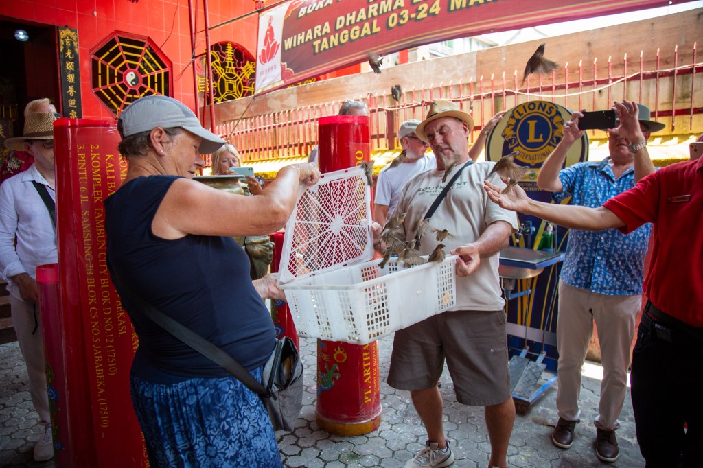 The temple is full of huge red candles at various alters. As we leave our guide has a cage of small birds and we are to make a wish as we release them. This is a Chinese ritual to free bad luck and negativity.