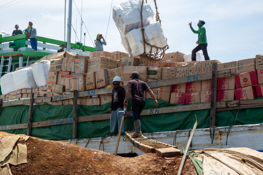 Heading back to the Arcadia and thinking that our tour was over we were suddenly surprised that we could go and watch some older ships being loaded. The workers had no safety gear on at all and the loading into large rope cargo nets had no organisation about it at all. It was so hot, dusty and smelly but Andy was revelling in it all. Climbing up and getting as many photos as possible. Back to the ship and air conditioning after a full day.